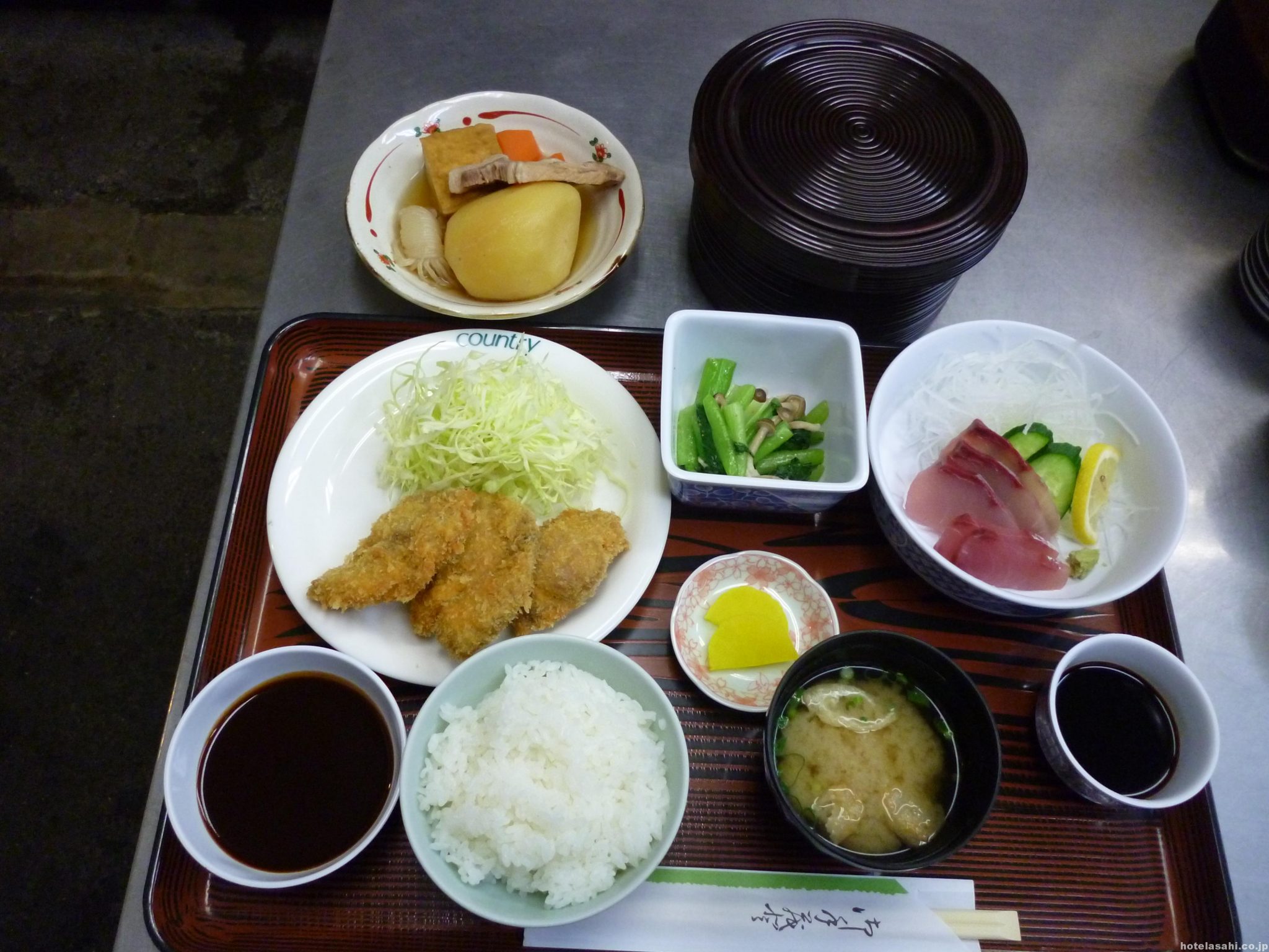 本日のメニュ-はハマチ刺身.ヒレカツ.小松菜キノコドレッシング和え.ジャガイモ煮物です