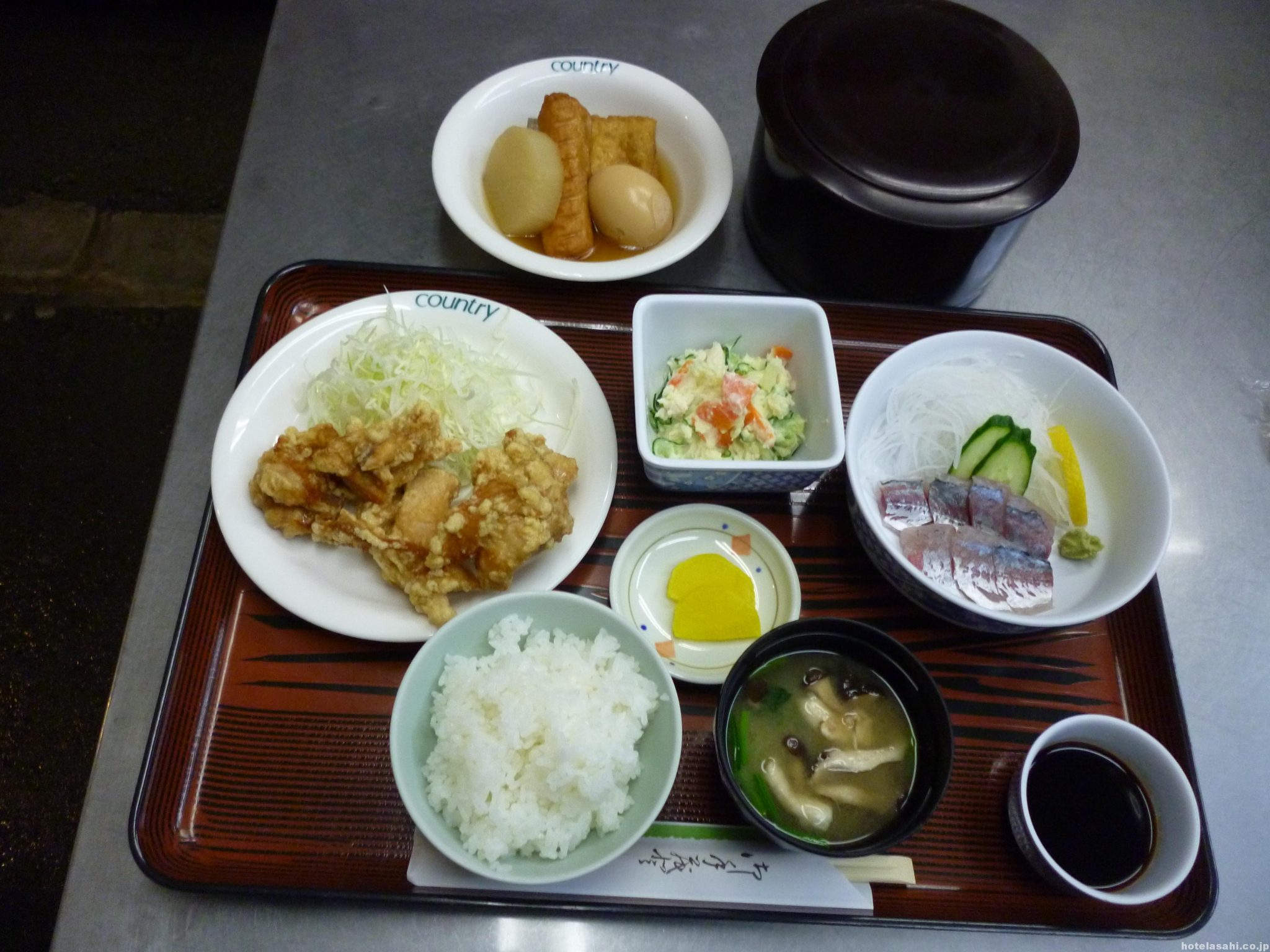 本日のメニューはアジ刺身、おでん、とりからあげ、ポテトサラダです。夕食は税込で1080円となっております(^^♪