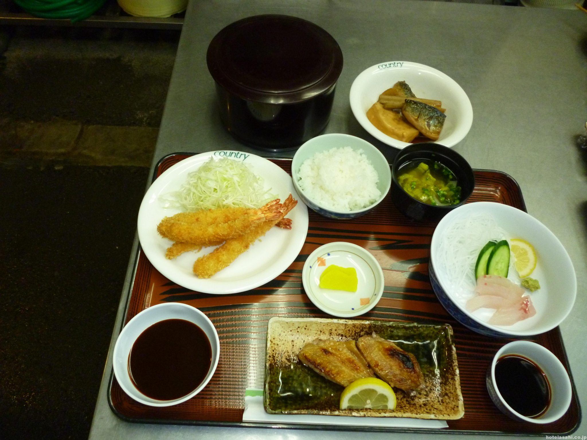 本日のメニュ-は鯛刺身.サバ煮付け.エビフライ.手羽先塩焼きです