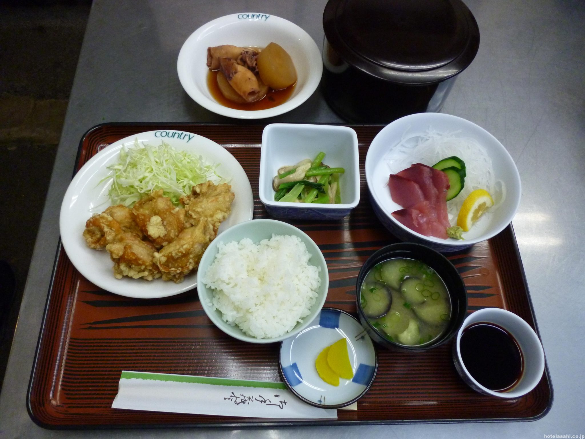 今日のメニュ-はコビン刺身.イカ大根煮物.鶏唐揚げ.小松菜しめじドレッシング和えです。