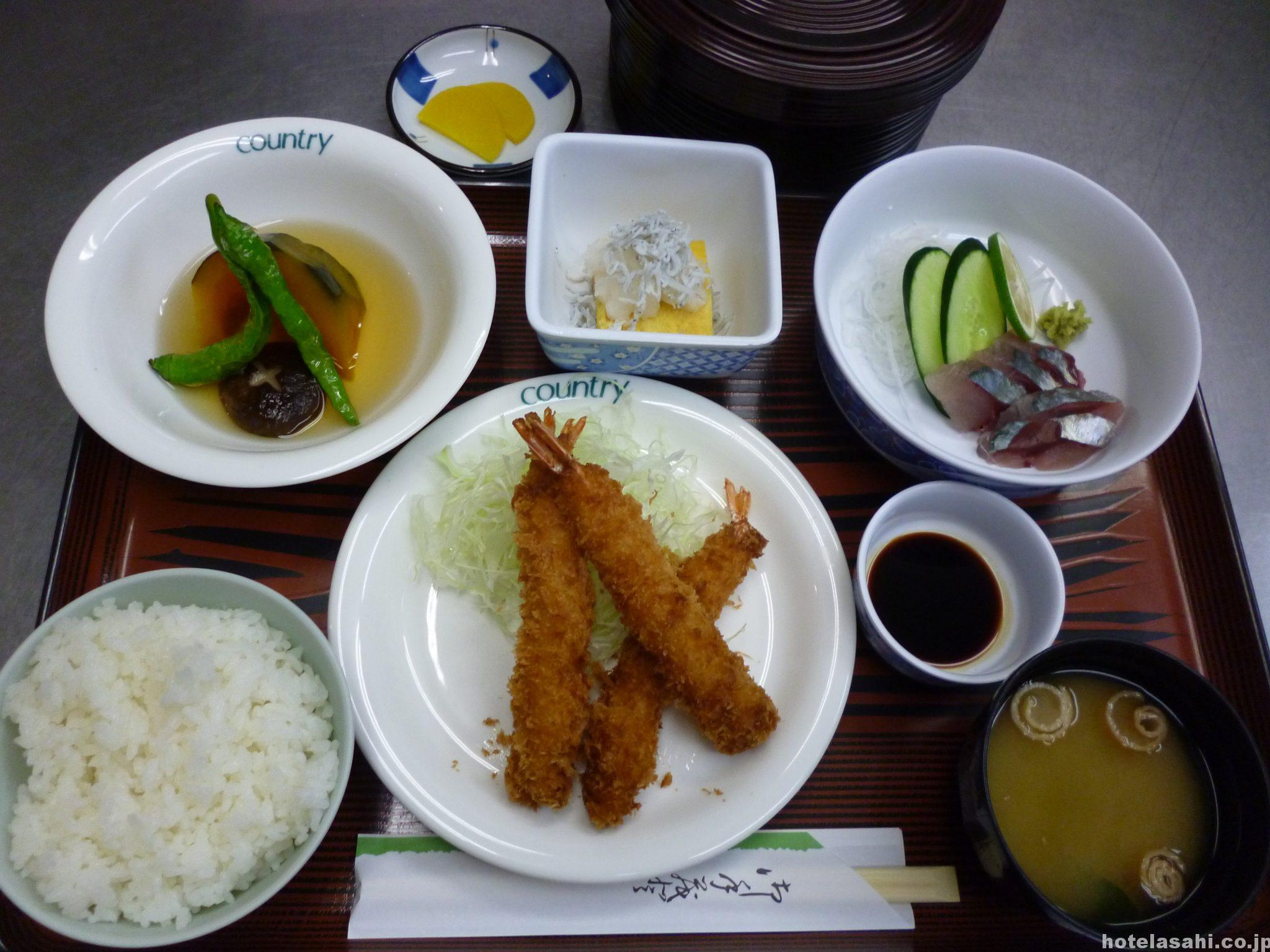 本日のメニューは、アジ刺身.かぼちゃの煮物、エビフライ.だし巻き卵とじゃこです。夕食は税込1080円となっております(^^♪