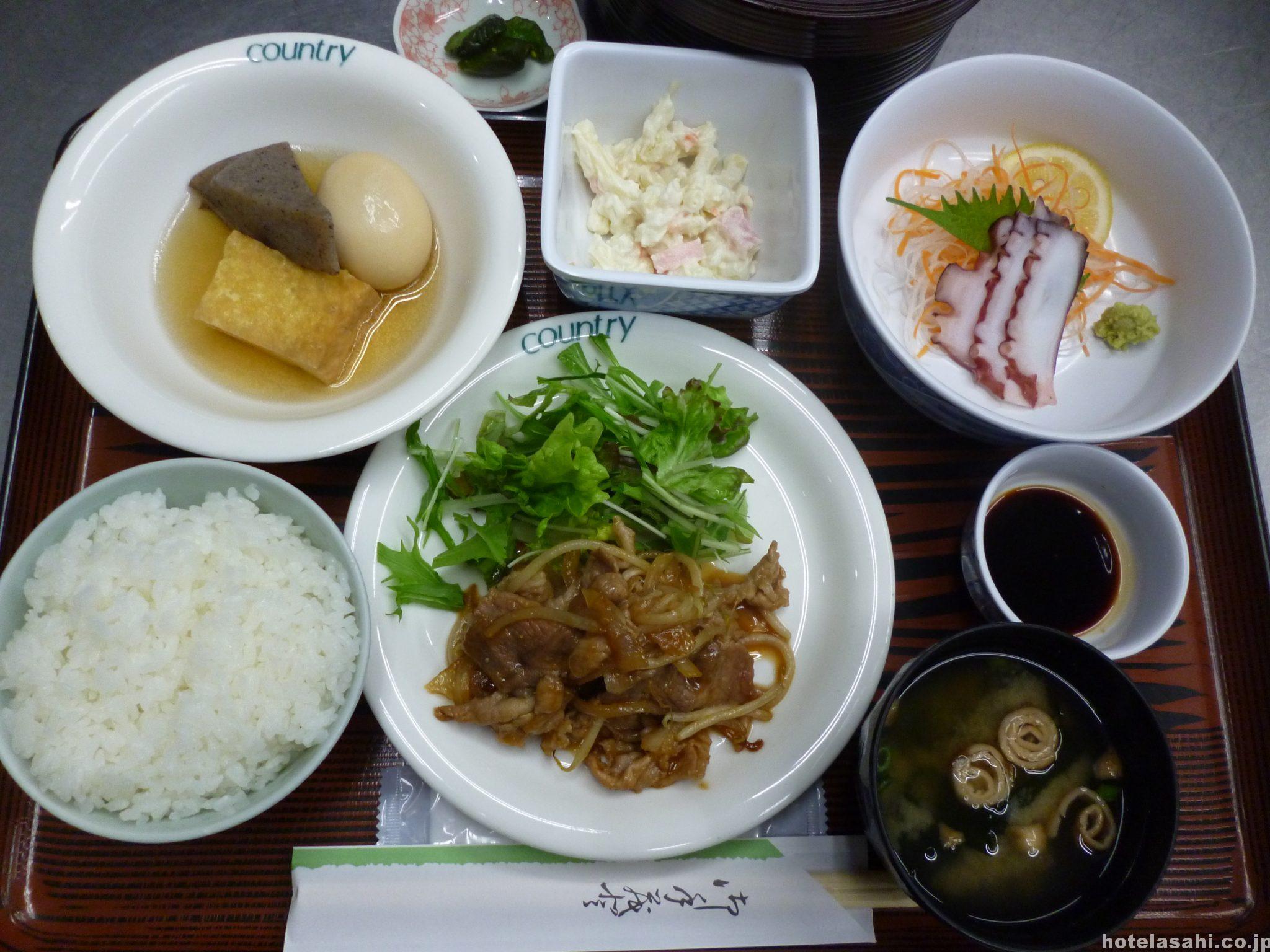 本日のメニュ-はタコ刺身.おでん.豚肉生姜焼き、マカロニポテトサラダです。夕食は税込1080円となっております(^^♪