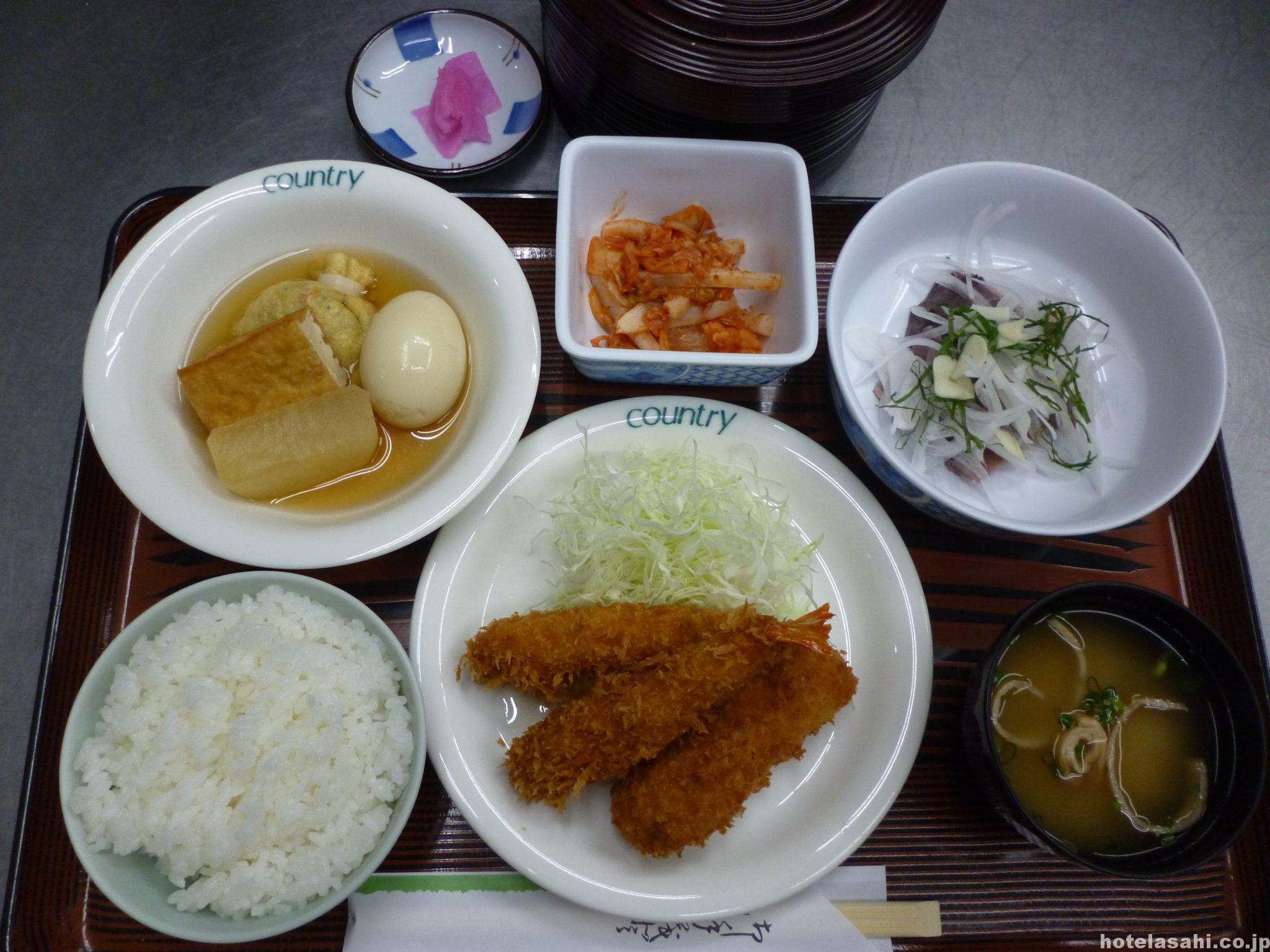 本日のメニューは、かつおたたき、おでん、エビフライとささみしそ巻き、イカキムチです。夕食は税込1080円となっております(^^♪