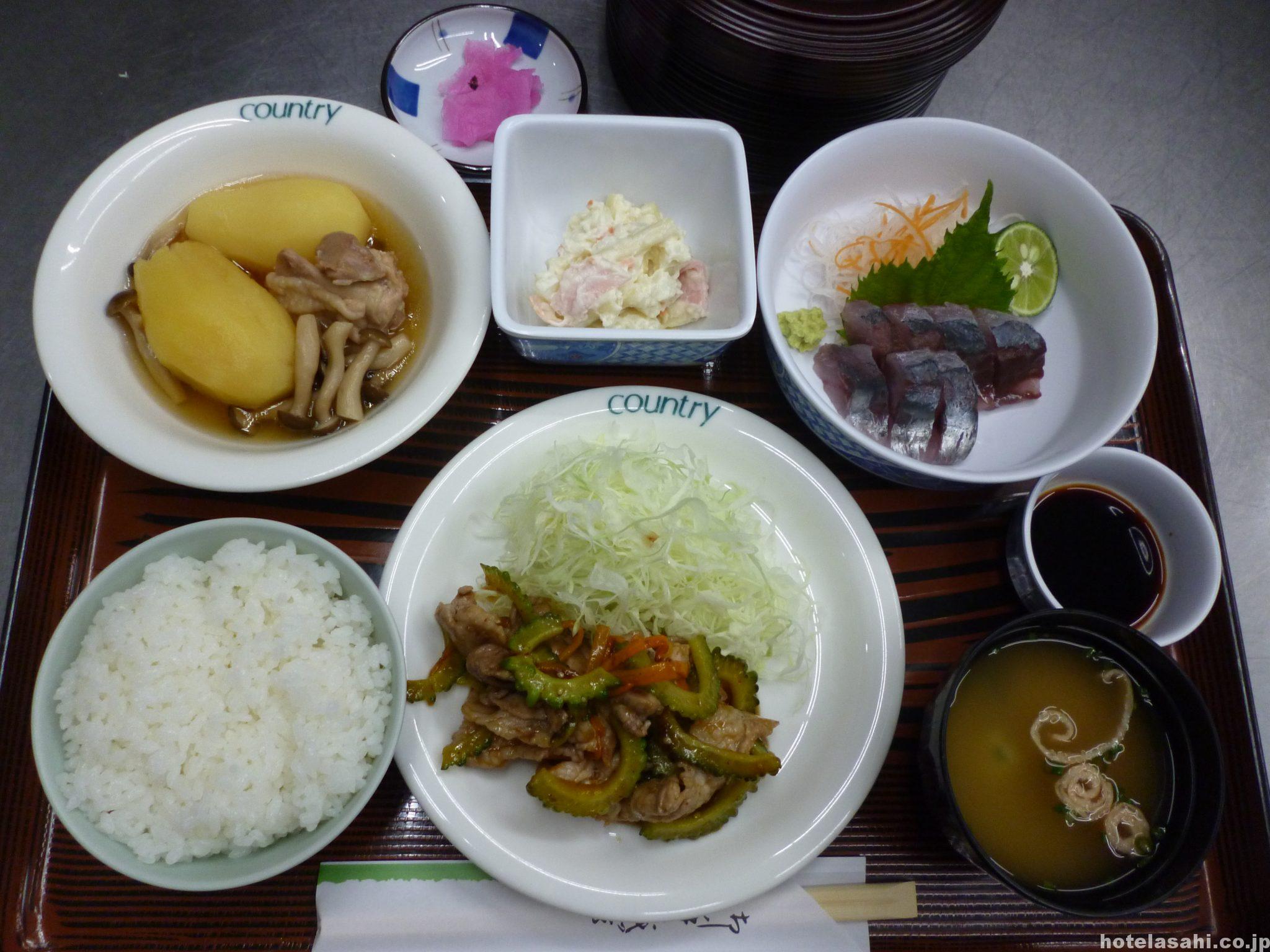 今日のメニュ-は青アジ刺身.鶏肉ジャガイモ.豚肉とゴ-ヤの焼肉風炒め、マカロニサラダです