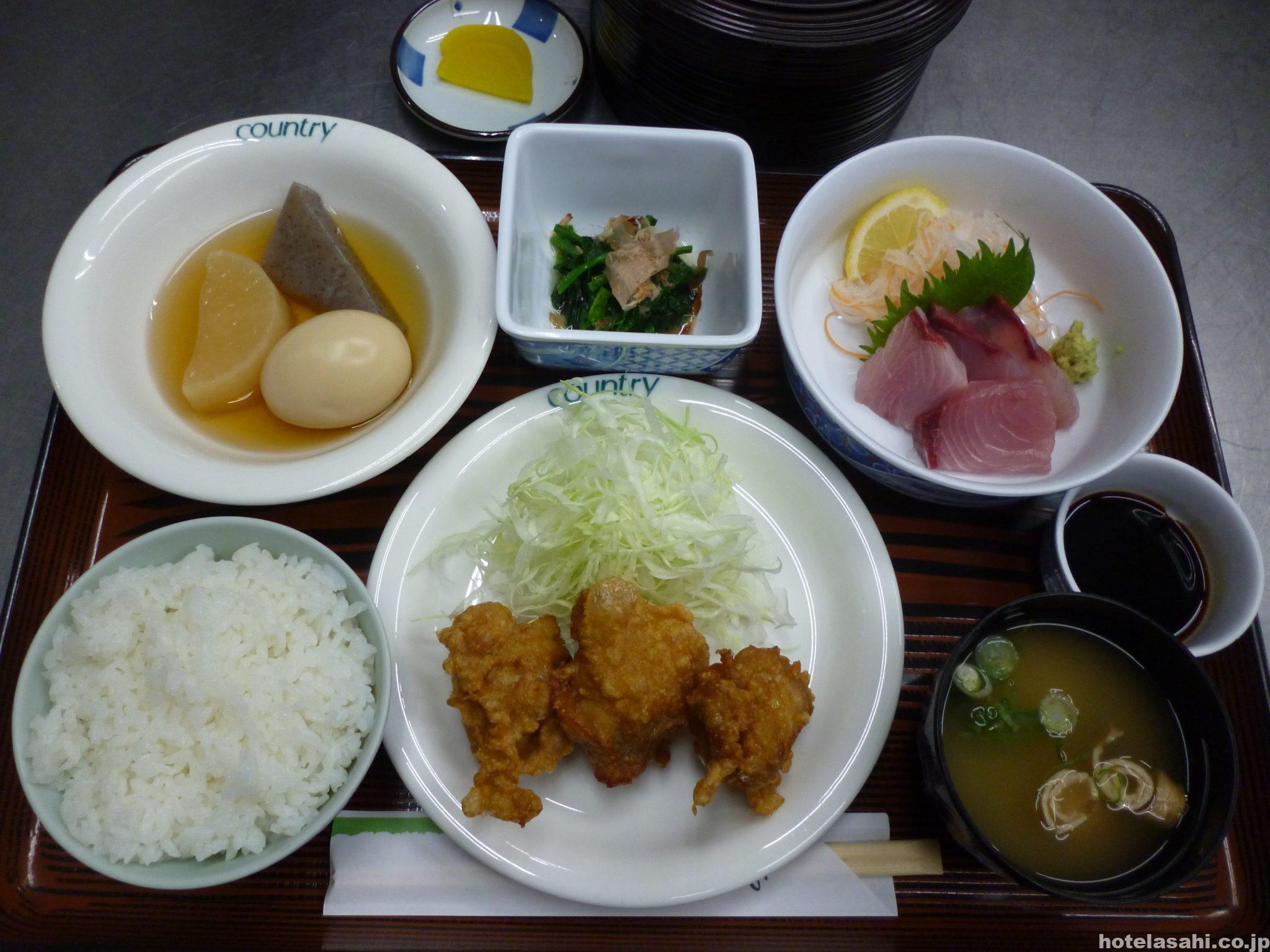 本日のメニューは、ブリ刺身.おでん、鶏から揚げ、ほうれん草のおひたしです。夕食は税込1080円となっております(^^♪