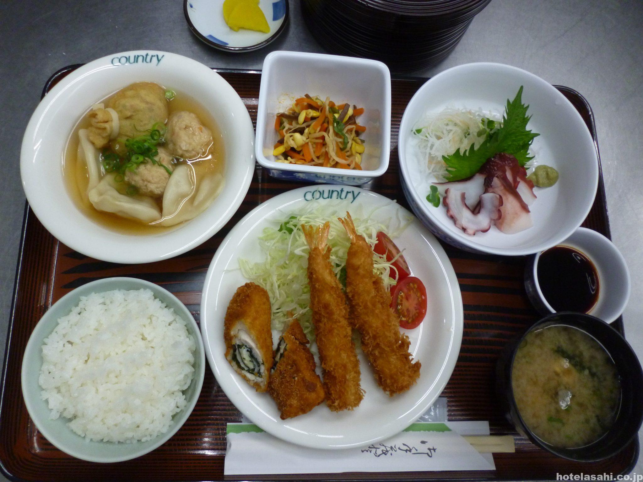 今日のメニュ-はタコ刺身.つくねと水餃子.エビフライと鶏肉しそ巻き.ビビンバです