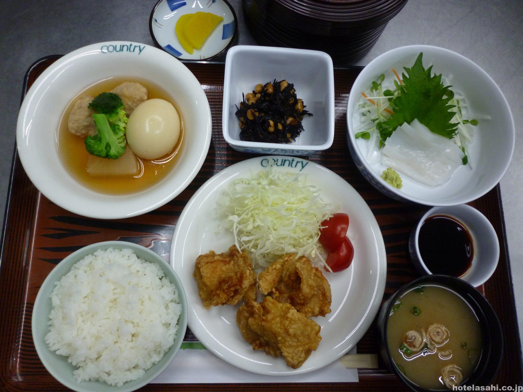 本日のメニューは、イカ刺身、つくねタマゴ煮、鶏からあげ、ひじき煮です。夕食は税込1080円となっております(^^♪