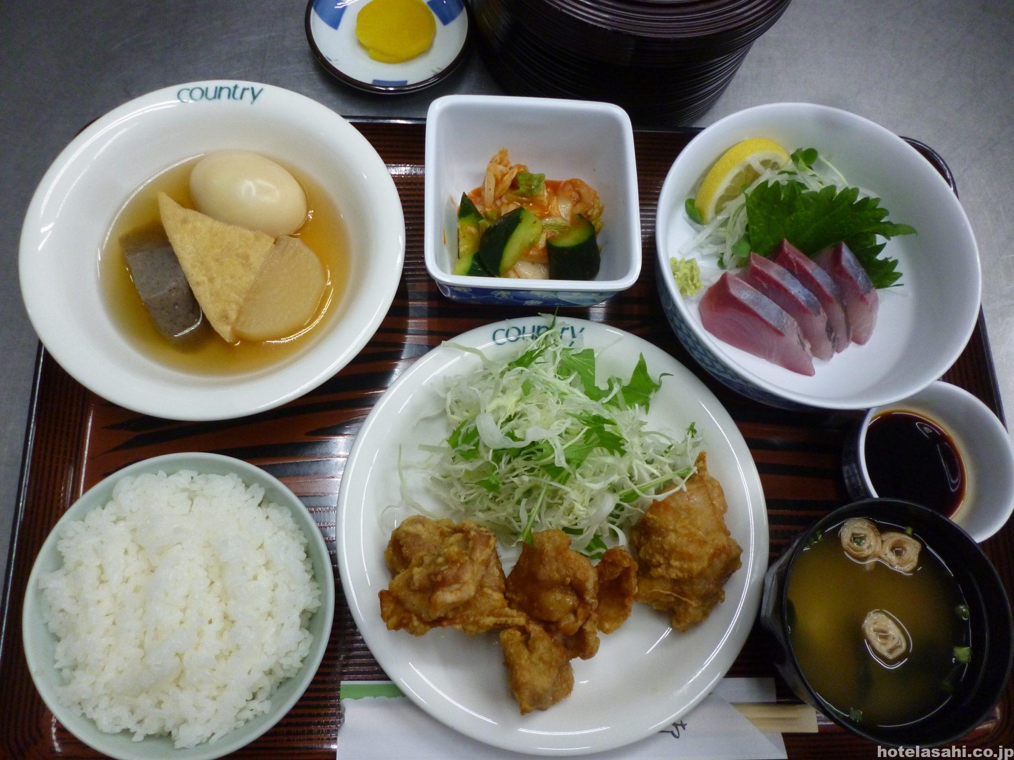 本日のメニューは、はまち刺身、おでん、鶏からあげ、キムチです。夕食は税込1080円となっております(^^♪