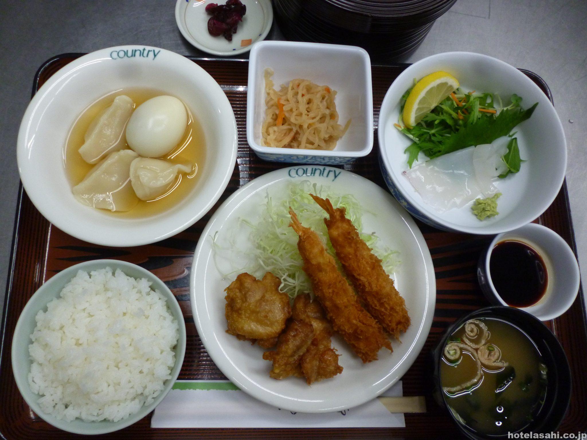 本日のメニューは、イカ刺身、水餃子タマゴ煮、エビフライと鶏からあげ、大根うま煮です。夕食は税込1080円となっております(^^♪