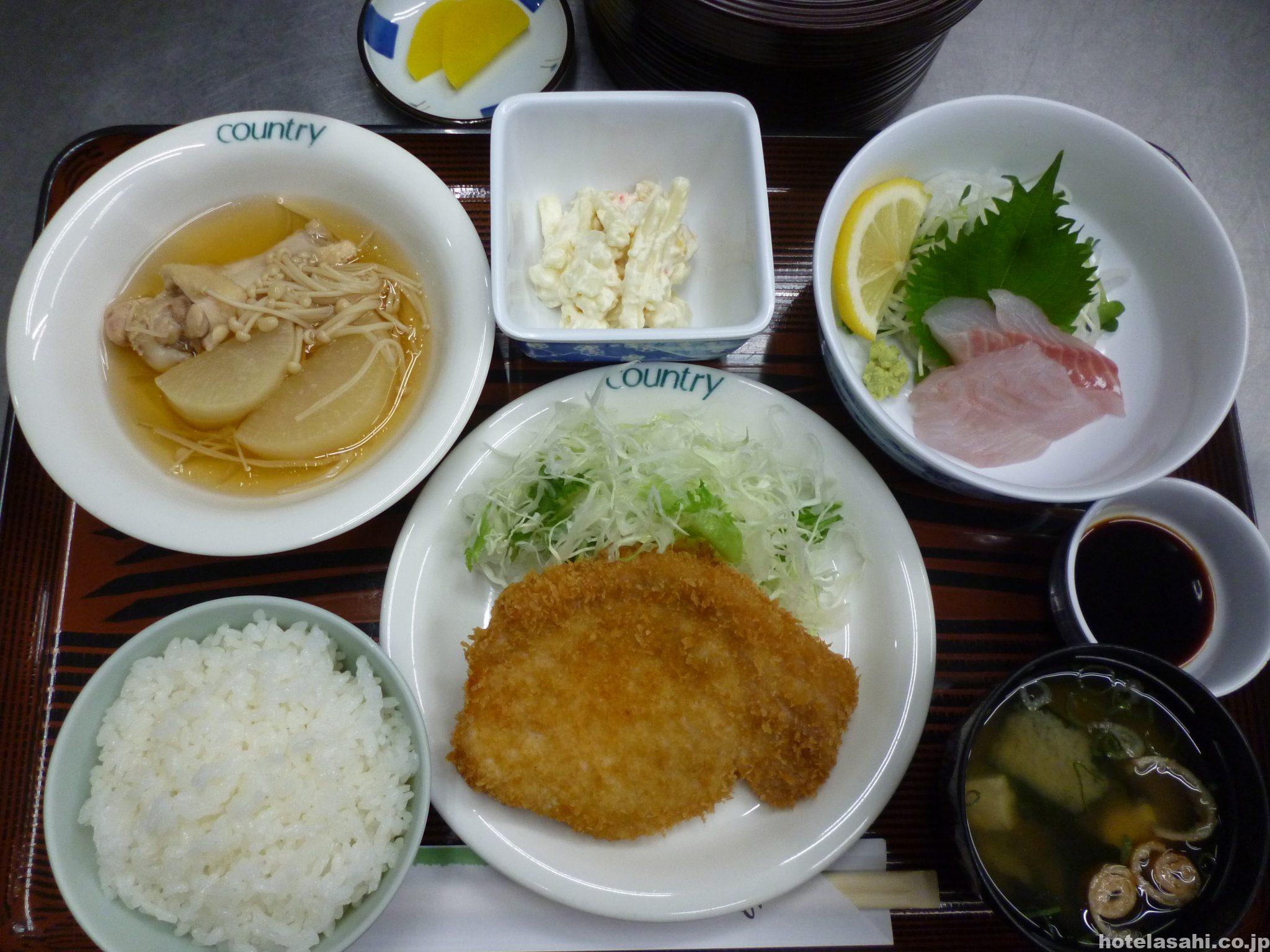 本日のメニューは、鯛刺身、手羽元大根煮、ポークカツ、コーンマカロニポテトです。夕食は税込1080円となっております。(^^♪