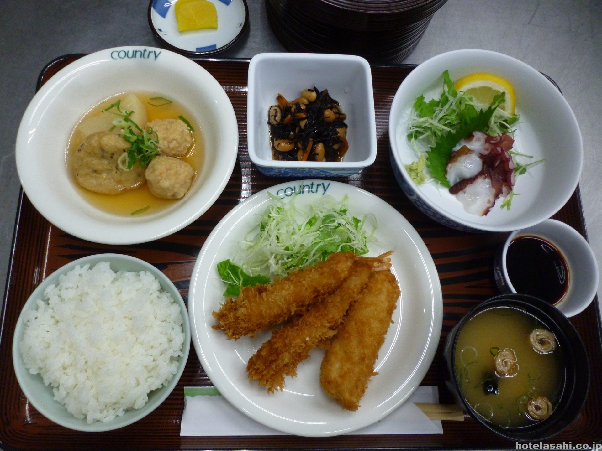 今日のメニュ-はタコ刺身.つくね大根煮.エビフライとササミしそ巻き.ひじき煮です