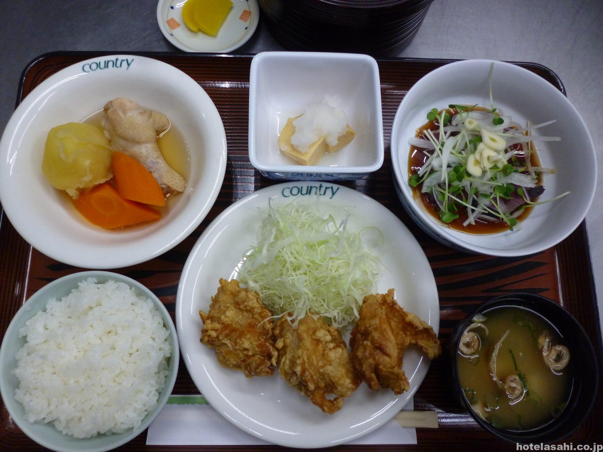 今日のメニュ-はカツオタタキ.手羽元ジャガ.鶏唐揚げ.だし巻き玉子です