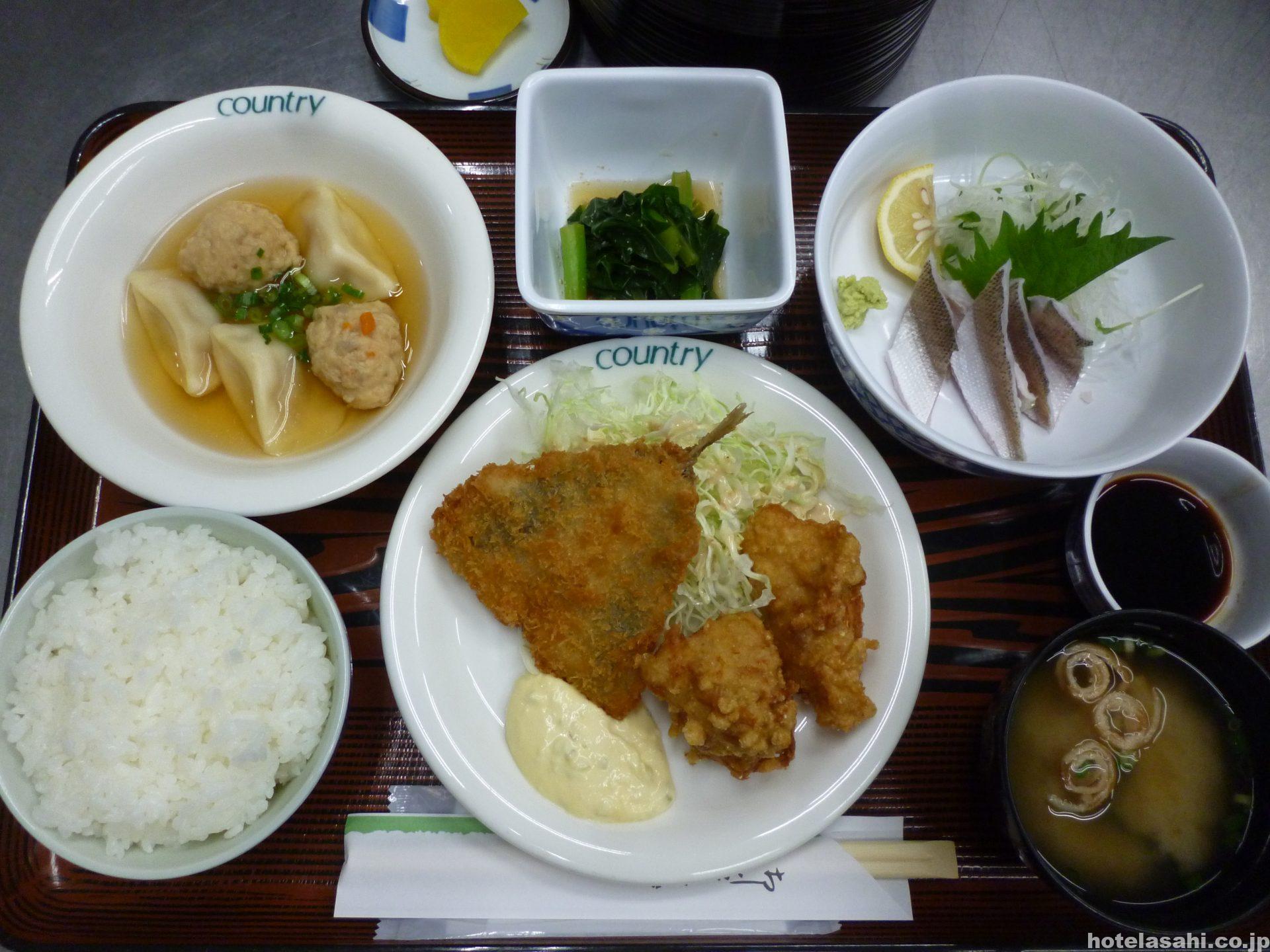 今日のメニュ-はカマス刺身.つくね水餃子.アジフライと鶏唐揚げ.小松菜おひたしです。