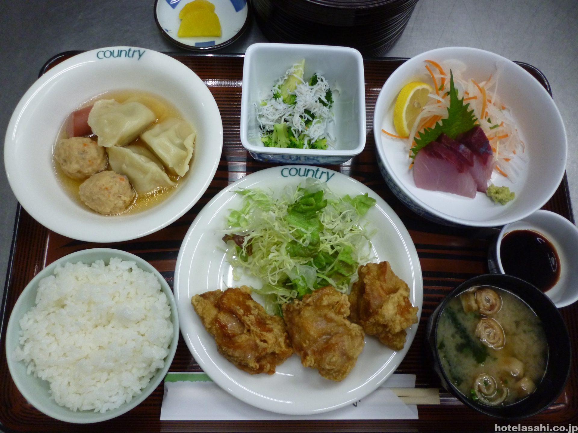 本日のメニューは、ブリ刺身、つくね水餃子、鳥から揚げ、じゃことブロッコリーサラダです。夕食は税込1080円となっております(^^♪