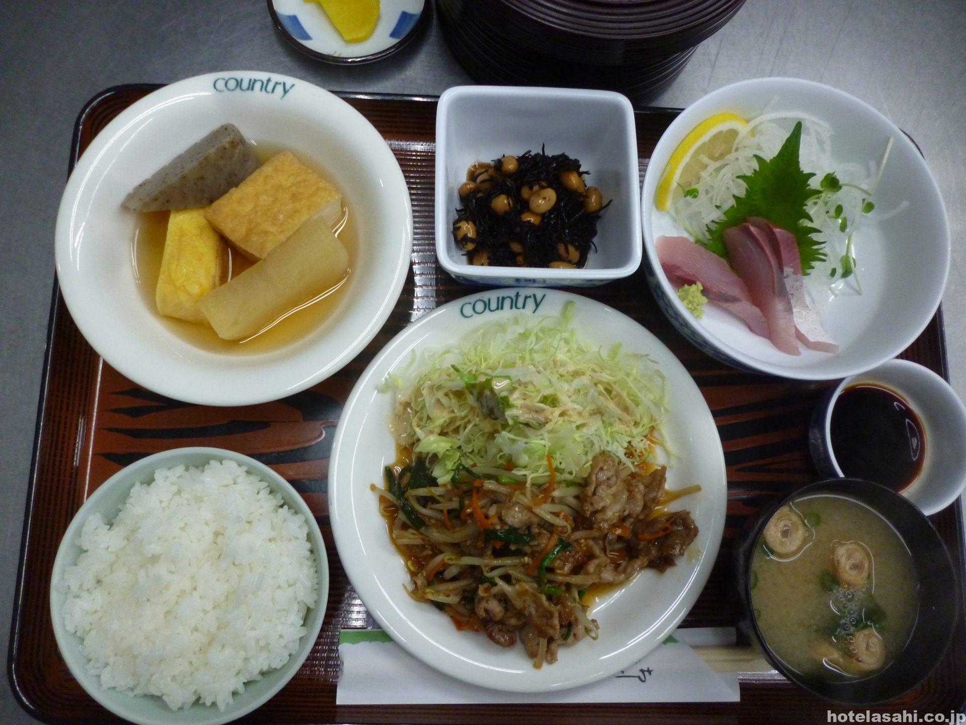 本日のメニューは、はまち刺身、おでん、豚肉ニラもやし焼肉風、ひじき煮です。夕食は税込1080円となっております(^^♪
