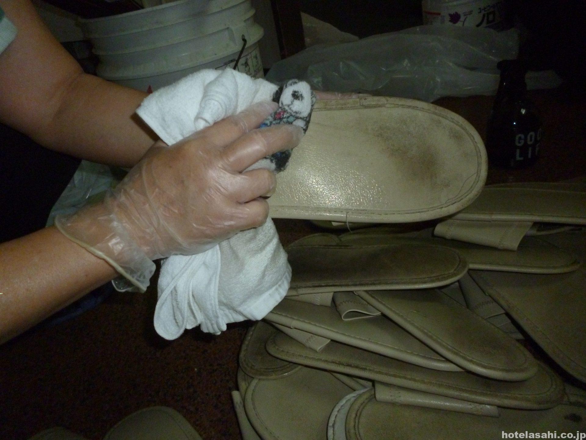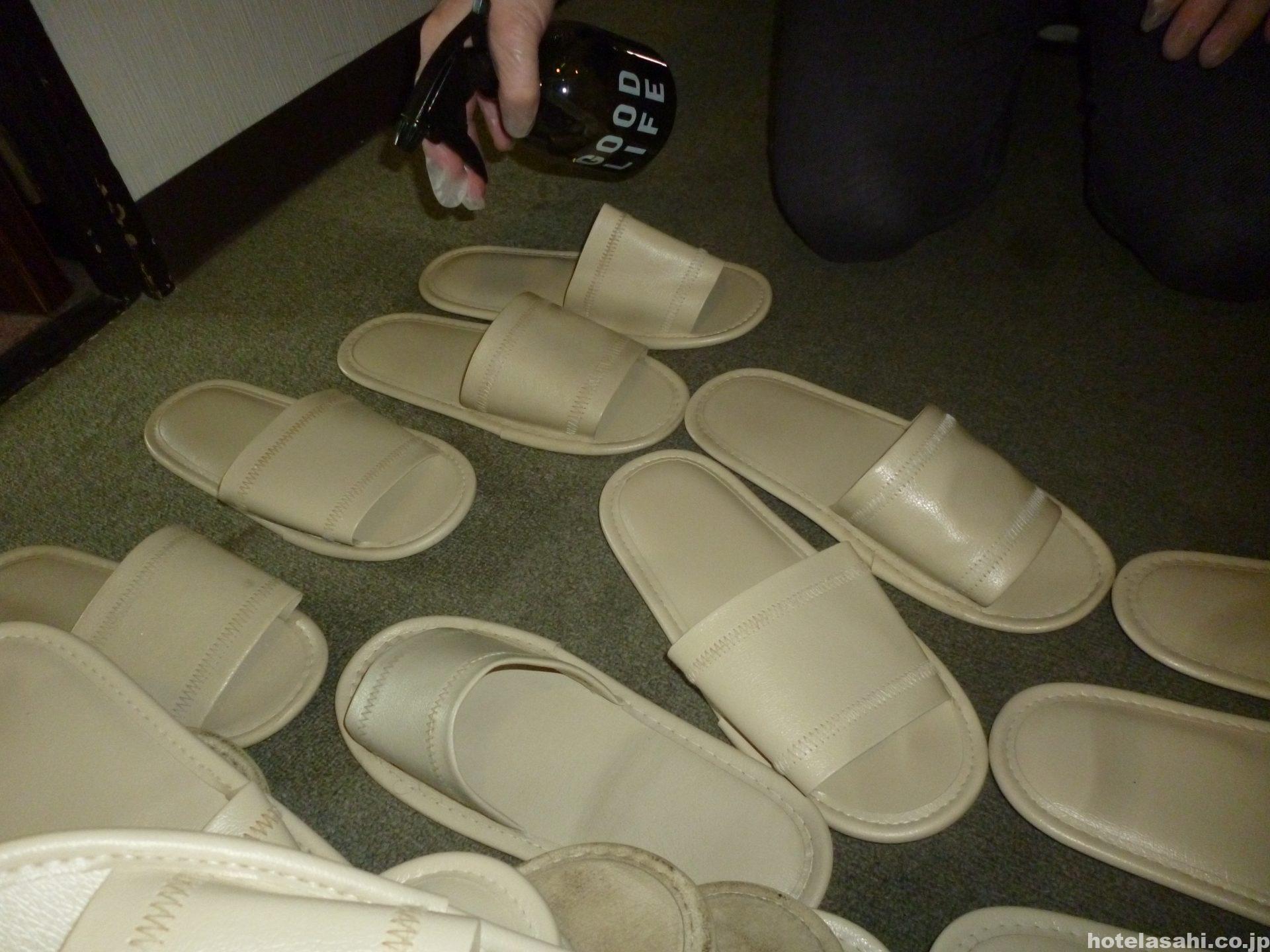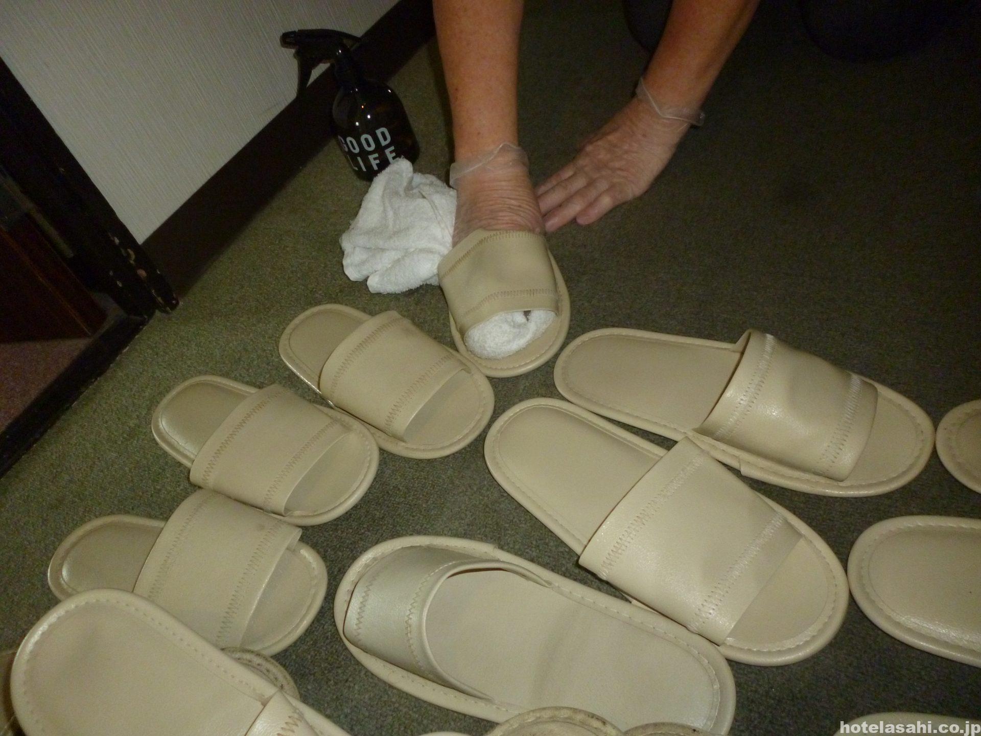 本日はスリッパの除菌の写真です.毎日除菌してますが客室に使い捨てスリッパも常備しています。