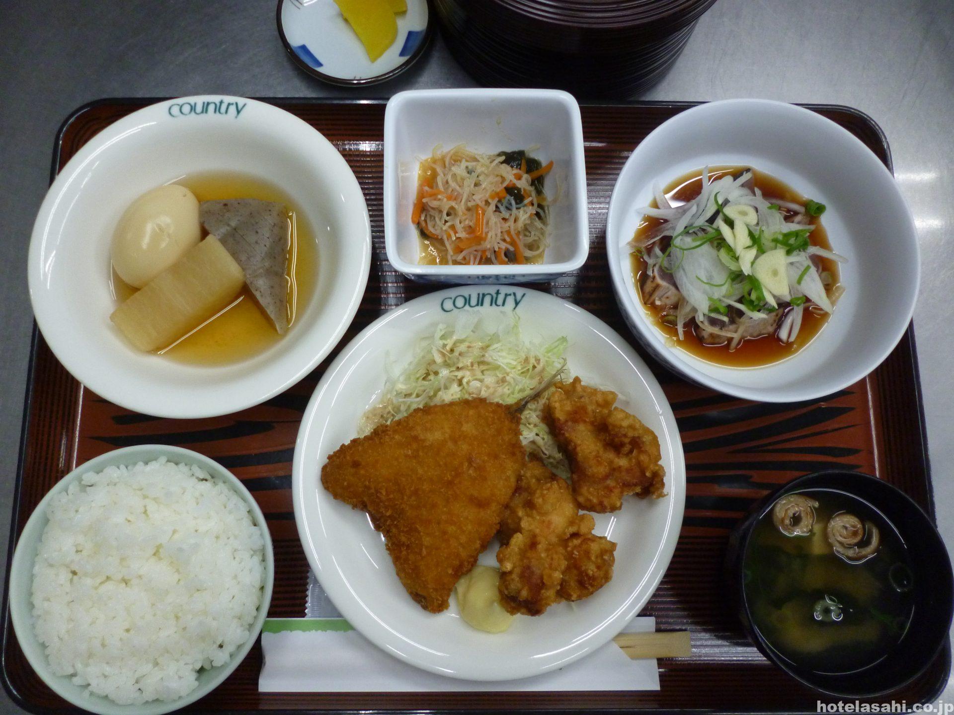 本日のメニューは、かつおたたき、おでん、アジフライと鶏からあげ、春雨サラダです。夕食は税込み1080円となっております(^^♪