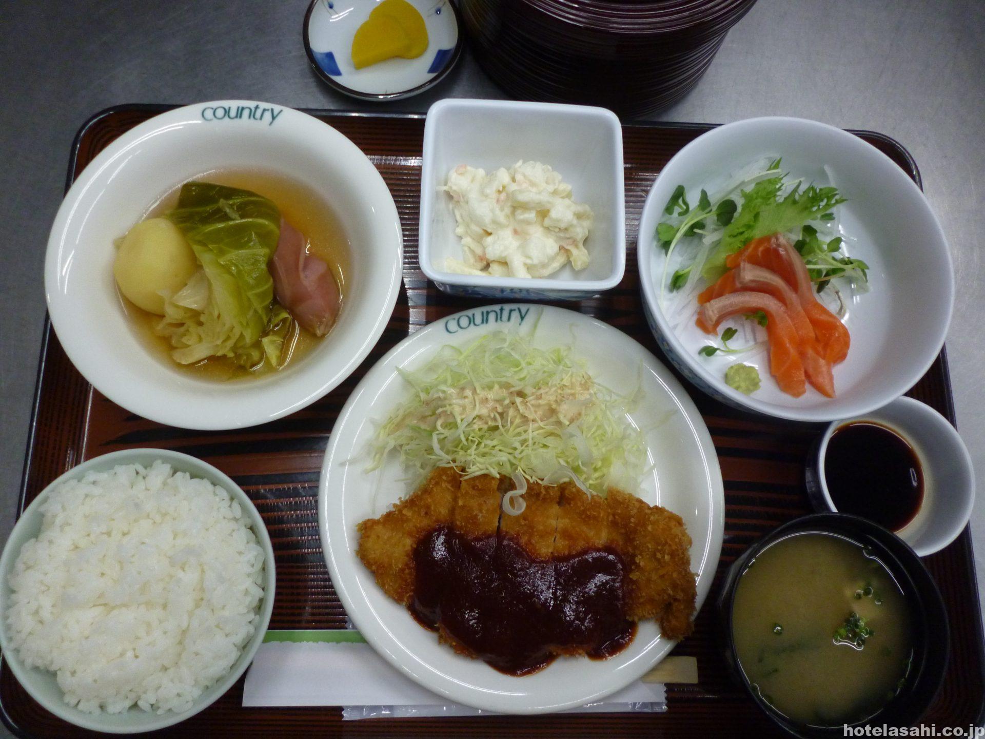 今日のメニュ-はサーモン刺身.ソ-セ-ジキャベツ煮.ポ-クカツ.マカロニポテトです