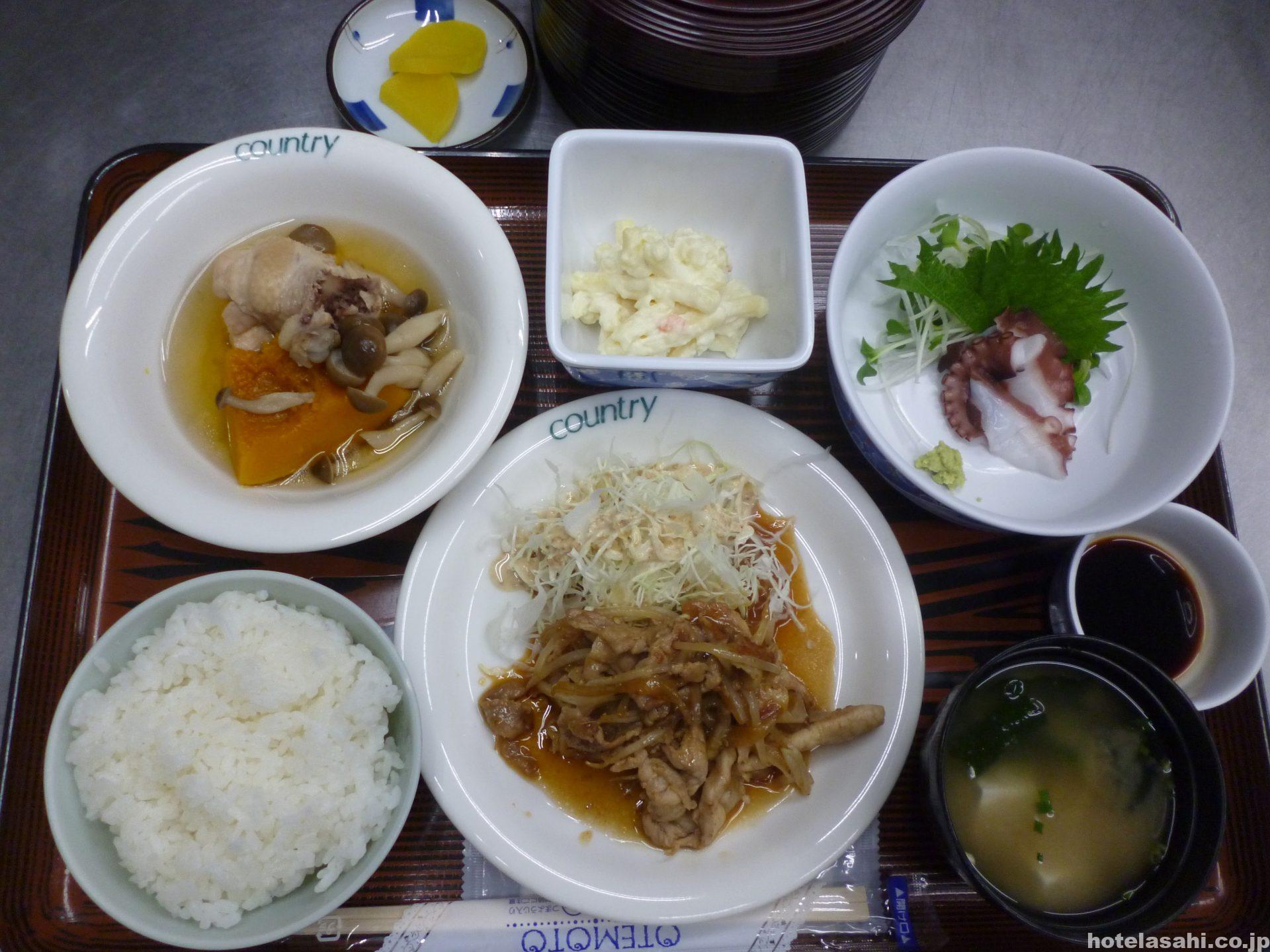 本日のメニューは、タコ刺身、手羽元カボチャ煮、豚肉もやし炒め焼肉たれ、マカロニポテトです。夕食は税込み1080円となっております(^^♪
