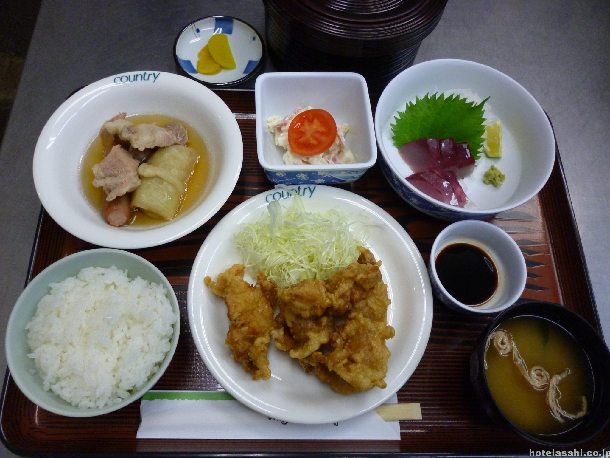 今日のメニュ-はハマチ刺身.ロールキャベツ.鶏唐揚げ.ベ-コンポテトサラダです