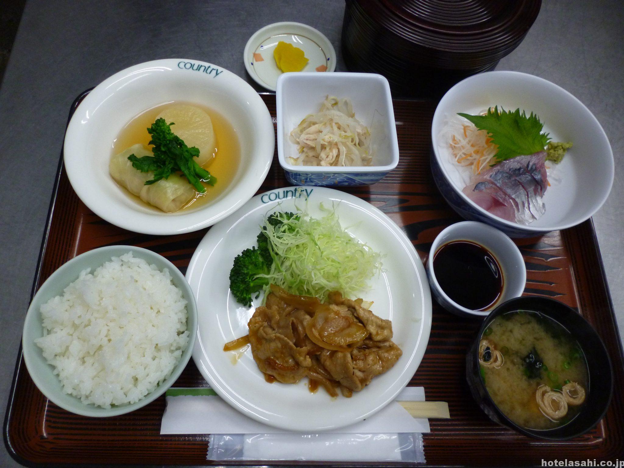 今日のメニュ-はアジ刺身.ロ-ルキャベツ.豚肉生姜焼き.鶏肉ともやしサラダです