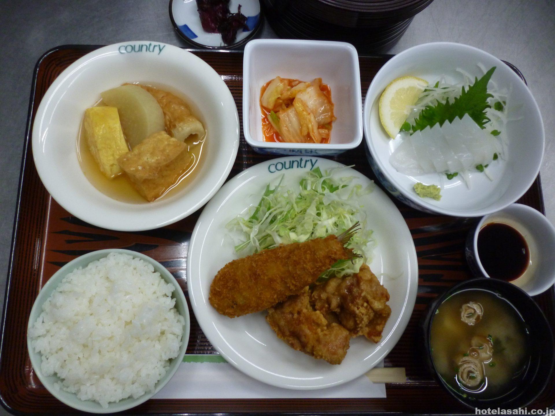 今日のメニュ-はイカ刺身.おでん、鶏唐揚げといわし梅しそフライ.キムチです。